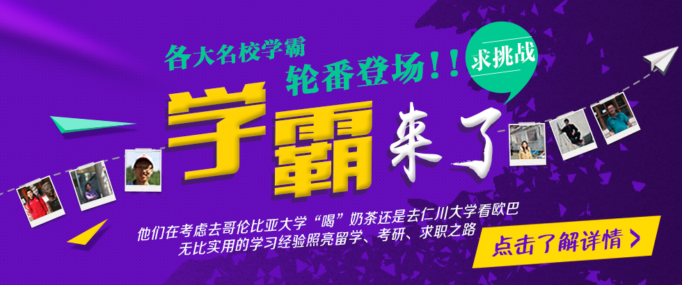 - 不同于高校教授专业严谨,也不同于培训班老师的题海解析,来自北大、清华、人大、北外等多所重点高校的优秀学子们立足自身经历,讲同学们最关注的话题,提供最实用的方法,分享最宝贵的学习经验。留学不再依赖中介,全程DIY的成功经验你也可以借鉴!跨专业读硕乃风险与机遇并存,你是否和她一样有过徘徊?横扫500强笔试、群面,是什么让他胸有成竹?这些不同个性的学霸展现了当代青年学子的灼灼风采。只要用心,你和学霸的距离其实很近。